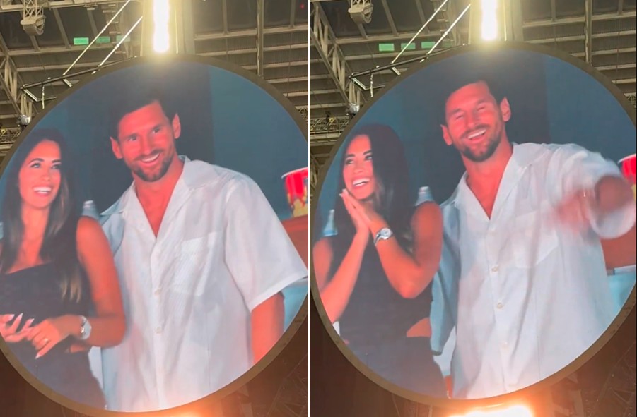 Lionel Messi e Antonela Roccuzzo marcaram presença no show do Coldplay em Miami, na noite deste domingo (27). O casal foi destaque ao surgir no telão da tradicional “kiss cam”, momento em que o público costuma esperar um beijo entre os casais.