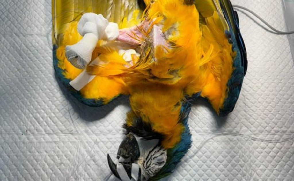 Arara-canindé tem asa amputada em cirurgia após ser encontrada ferida na BR-153