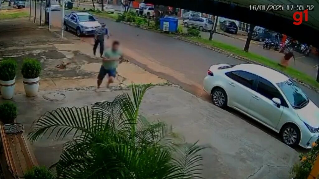 Imagens de câmera de segurança mostram que o homem cortava uma árvore do canteiro, até que o suspeito sai de um estabelecimento, apontando a arma. A vítima começa a correr, joga a motosserra na calçada e é perseguida pelo suspeito, que dispara.