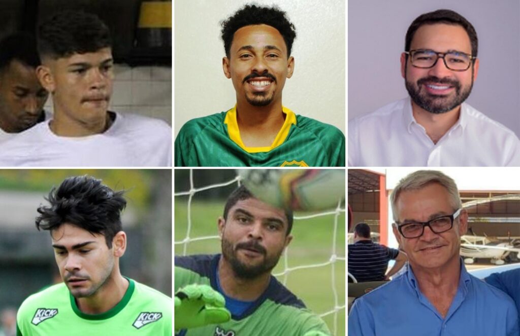 Vítimas do acidente aéreo que levava parte da delegação do Palmas Futebol e Regatas, do topo esquerdo, em sentido horário: o atacante Marcus Molinari, o lateral-esquerdo Lucas Praxedes, o empresário Lucas Meira, o piloto Wagner Machado, o goleiro Ranule e o zagueiro Guilherme Noé