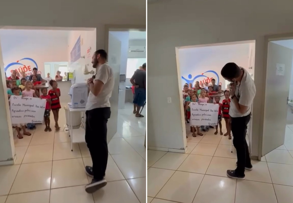 Segundo o médico, ele estava trabalhando quando uma colega, técnica de enfermagem, o chamou. Quando Thiago saiu do consultório, viu as crianças e professores preparados para a homenagem. “Senti que era a resposta a todo amor que empreendi nesses anos de trabalho lá”, disse.
